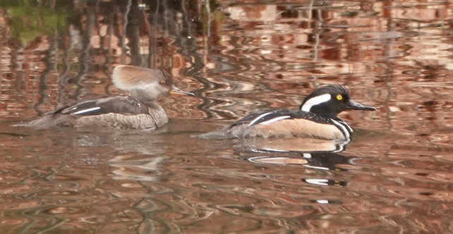 As for waterfowl, common mergansers, bufflehead, and common golden-eye were seen on Flint’s Pond, and wood ducks can be observed on various secluded ponds. The wood ducks will nest in tree cavities, sometimes 30 feet or more above ground. Years ago I had the good luck to see the fluffy baby ducklings leap from the hole, shake themselves off, and follow mom single-file to the nearest pond. Hooded mergansers have been observed in various locations; they also nest in tree cavities. Mute swans are nesting on Farrar Pond in the same spot as a year ago.