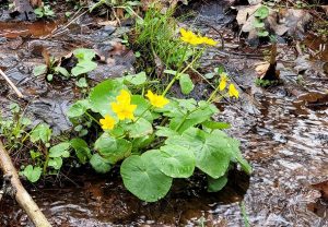 Spring colors are slowly painting the landscape. Lawns and fields are greening, willows are turning yellow, and red maple flowers are giving a reddish cast to the woods. Daffodils and forsythia bloom around houses and we admire the annual show of magnolias along Lincoln Rd. near the CCF gardens. Dandelions are hardy, giving us spots of bright yellow even from tough terrain such as gravel driveways. You might come across spicebush in flower as you walk a woodland trail; pinch a leaf or stem and sniff to see where it gets its name. Before long marsh, marigolds will be blooming near streams. As I wrote a year ago, “Non-native shrubs such as honeysuckle and multi-flora rose are among the first to leaf out, which gives them advantages over native shrubs. Quoting an article by researchers at Penn State, “The longer period with leaves gives invasive plants an advantage in acquiring more energy from sunlight and their leaves create shade in early spring and late fall that may limit growth of native species, such as forest ephemeral wildflowers….. This helps explain their negative impact on native tree regeneration, plant diversity and abundance.” It is garlic mustard season; signs around town remind us to pull this invasive plant.