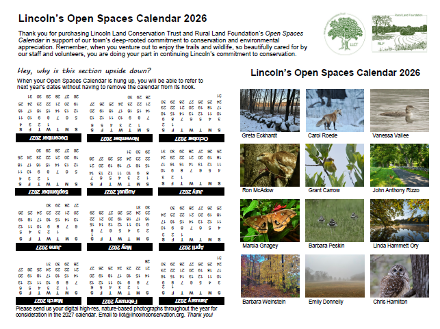 Each year, LLCT creates an Open Spaces Calendar which celebrates Lincoln’s many vistas. Not only a handy reference, the calendar is eye-candy for your wall all year round! A $100 membership donation receives a free calendar, so check out our membership page too!