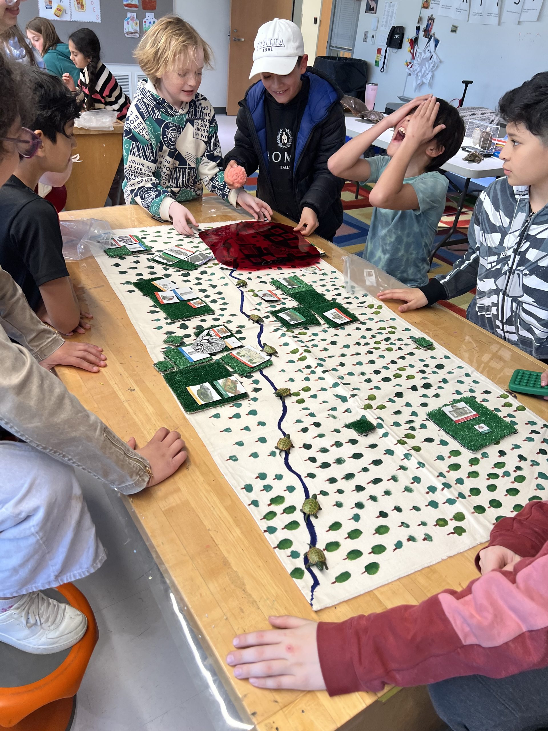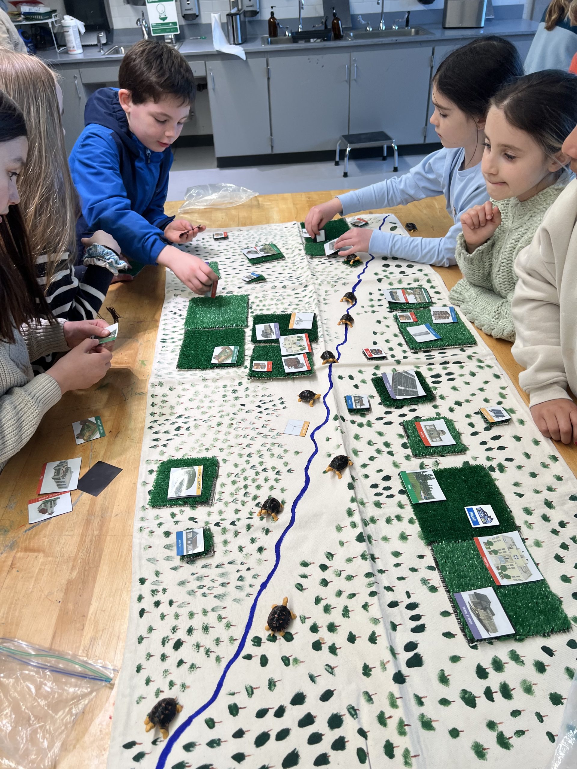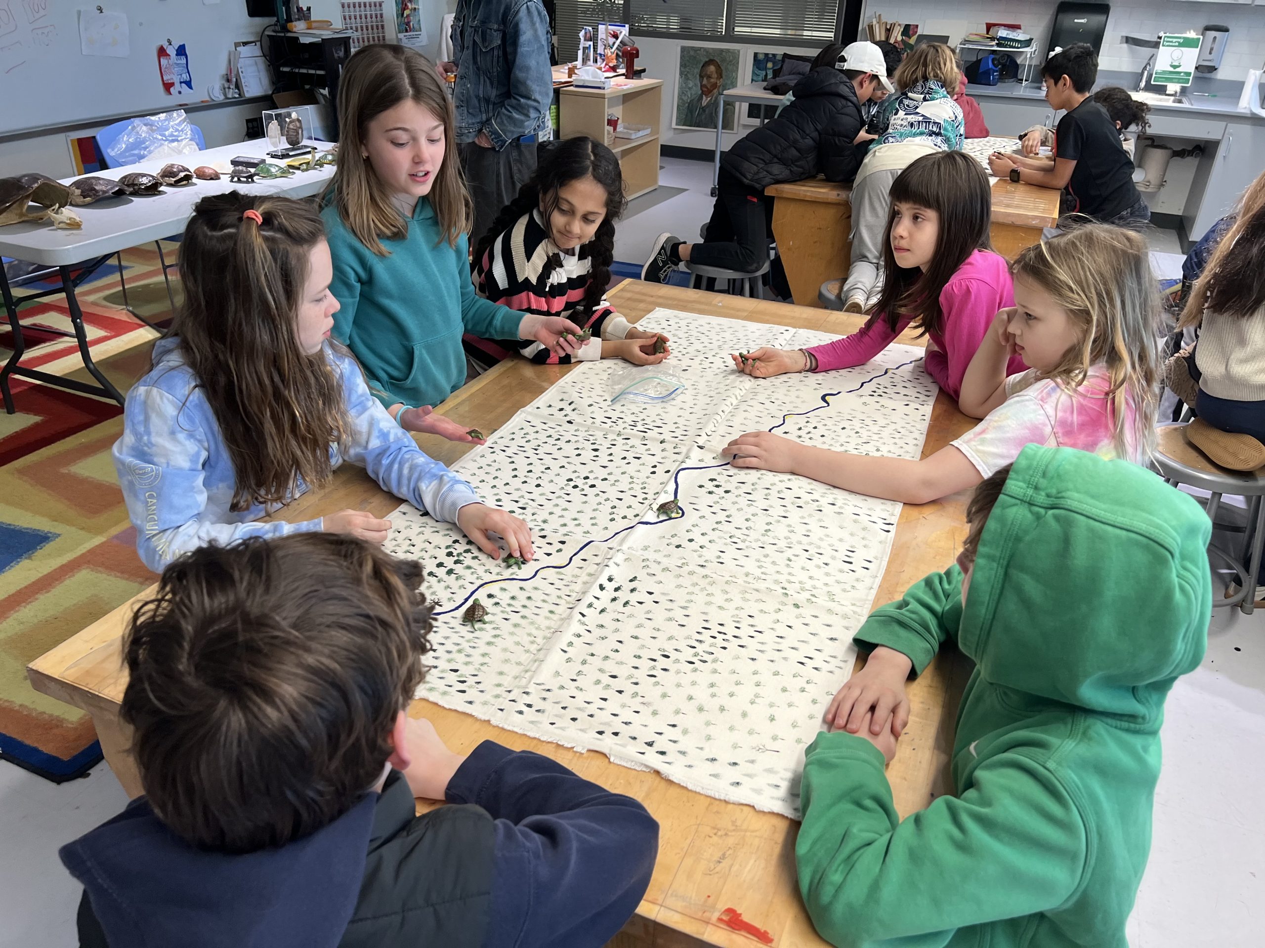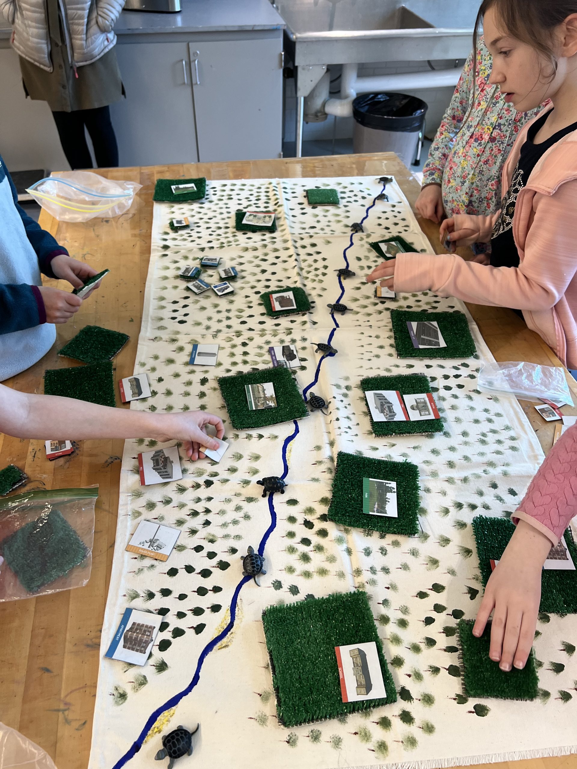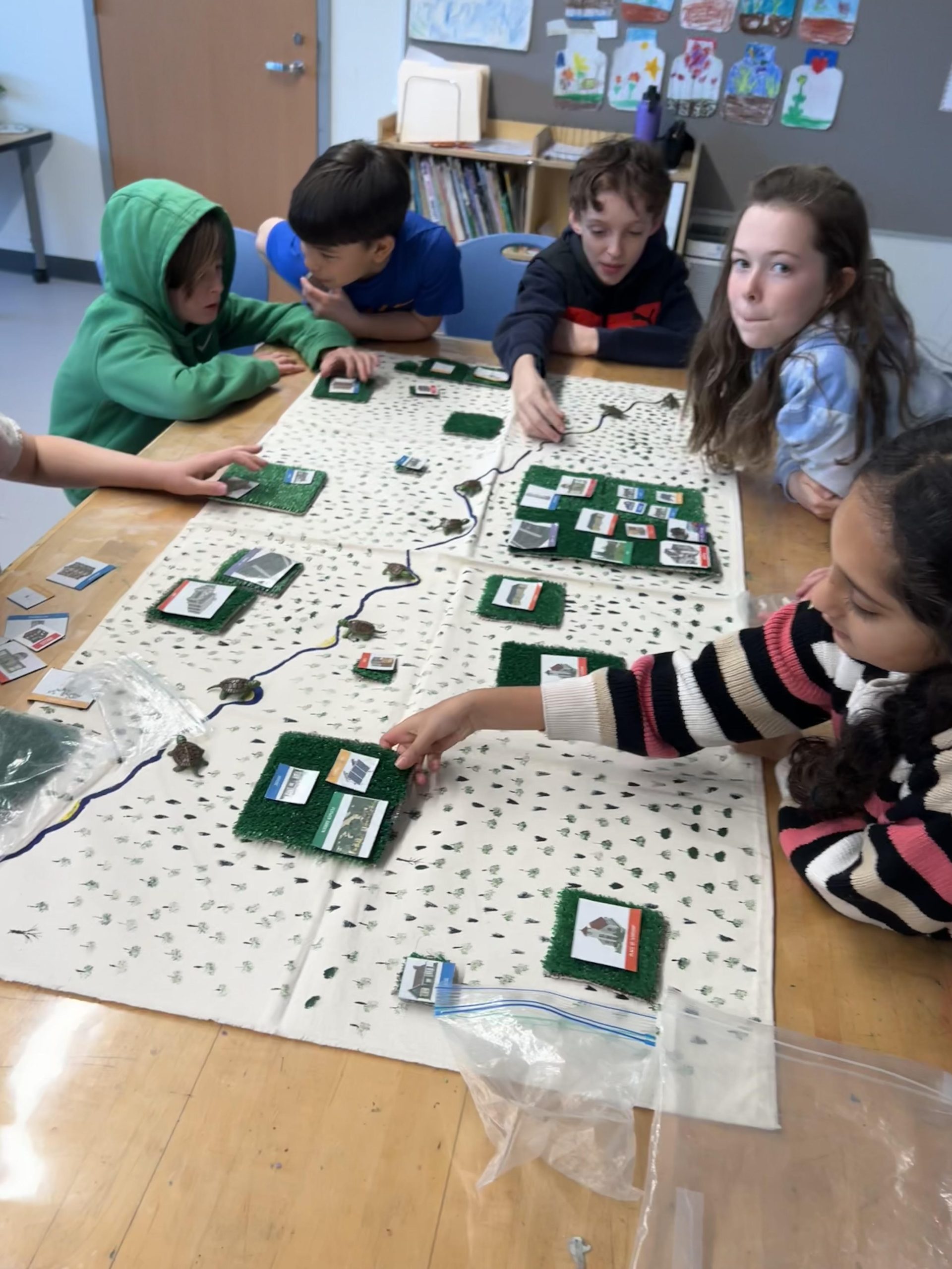 Turtle time: Students were first given plastic turtles and asked to lay them out evenly along a stream, representing a stable population in an undisturbed environment.