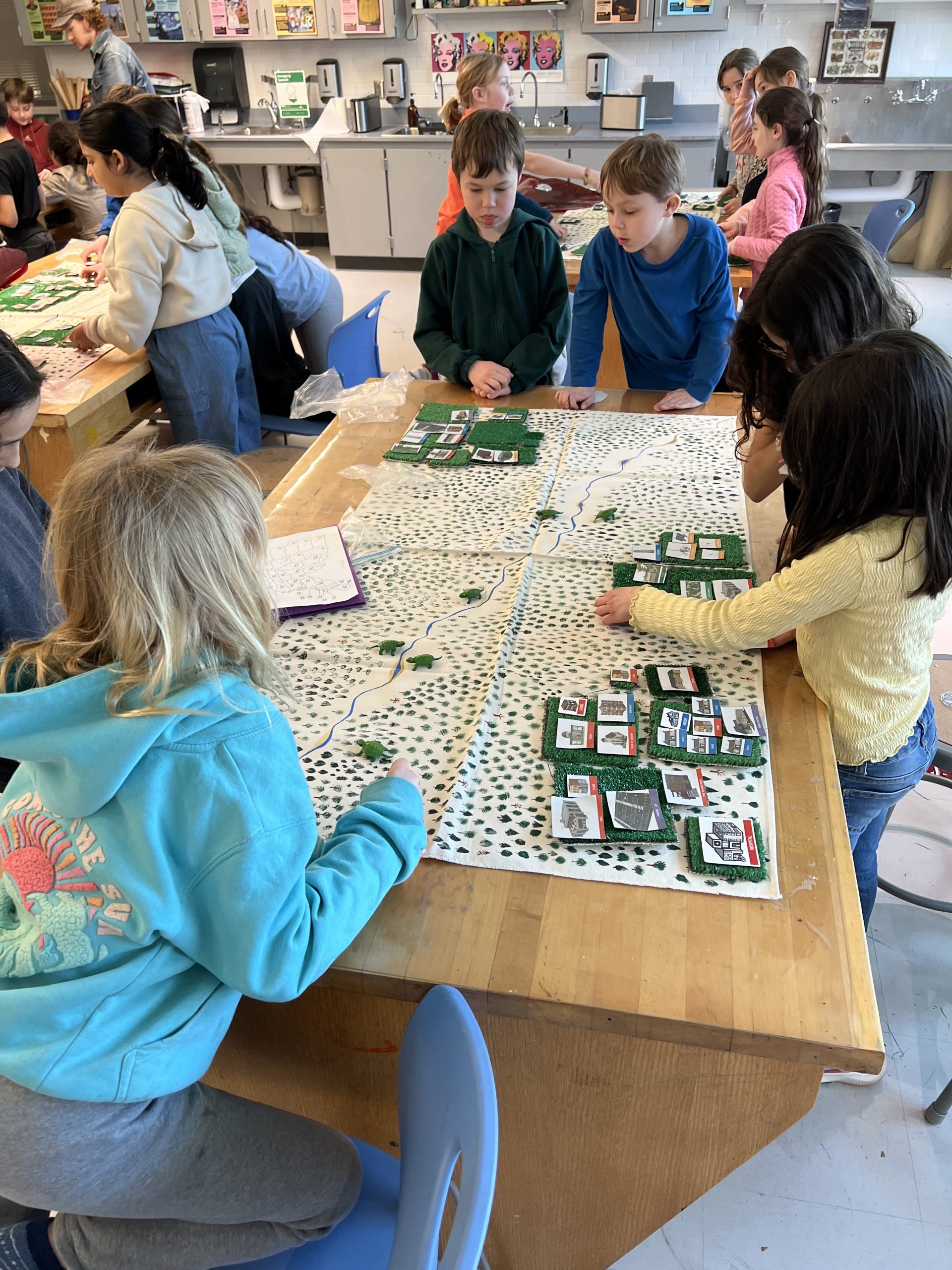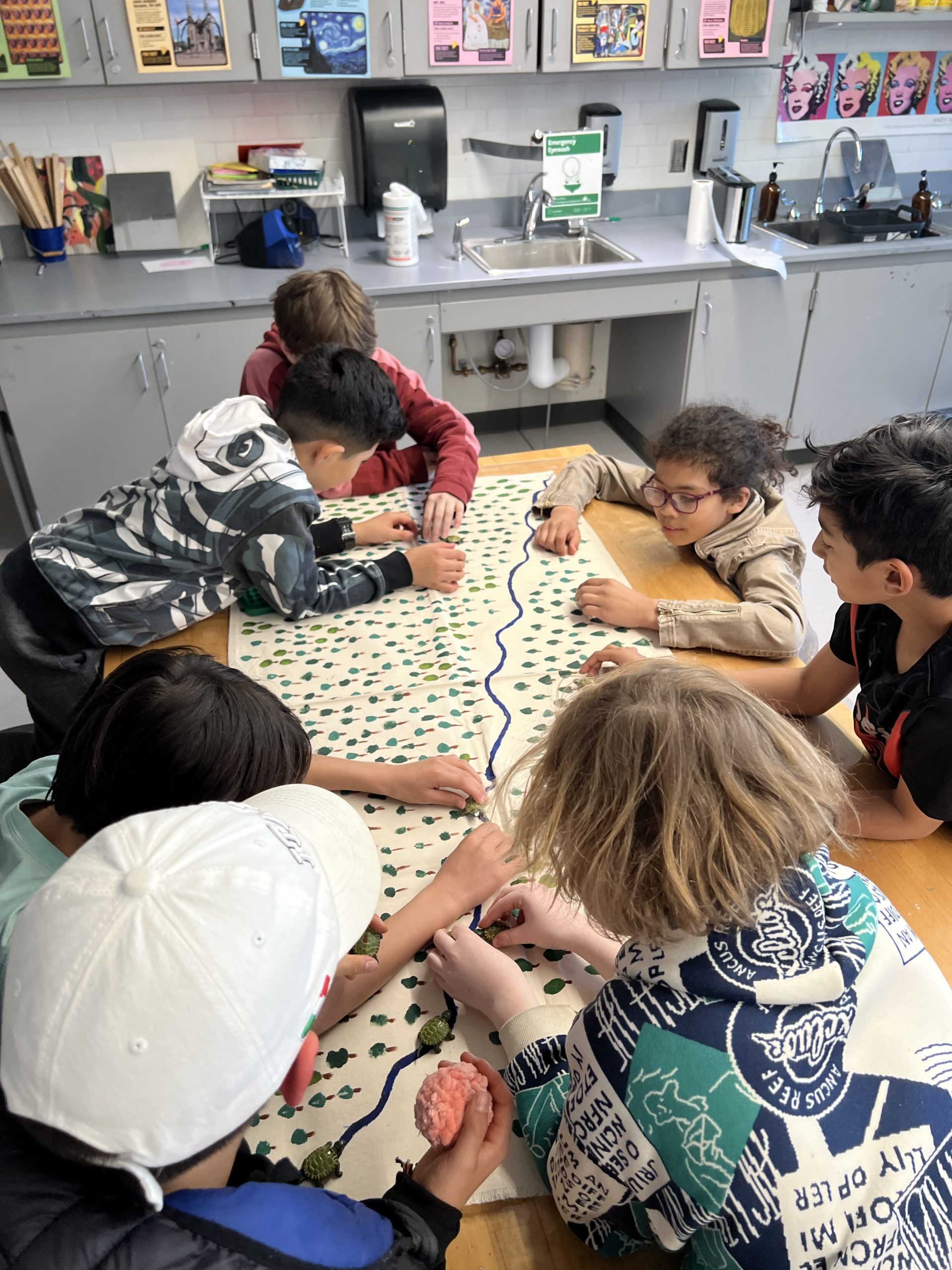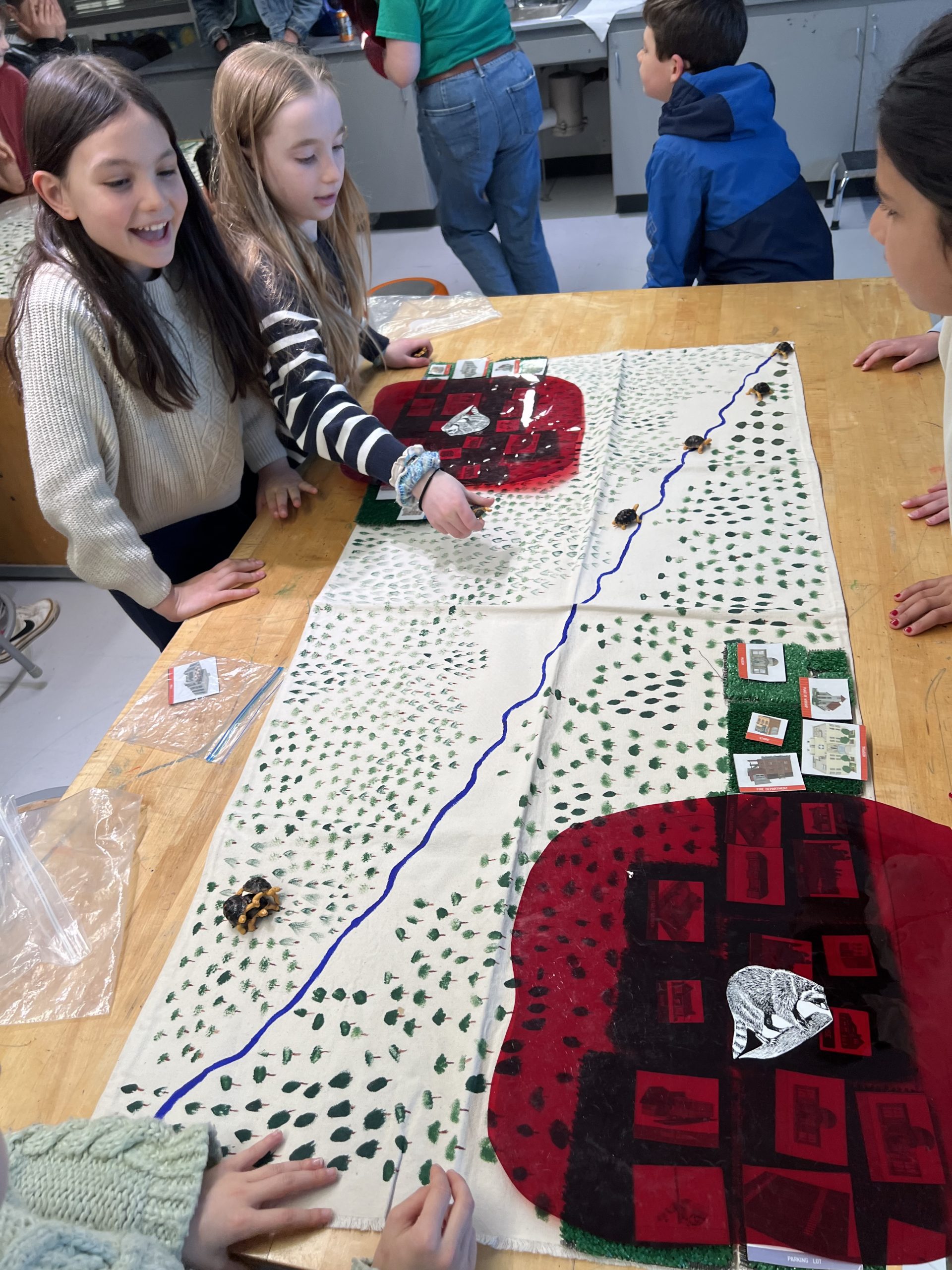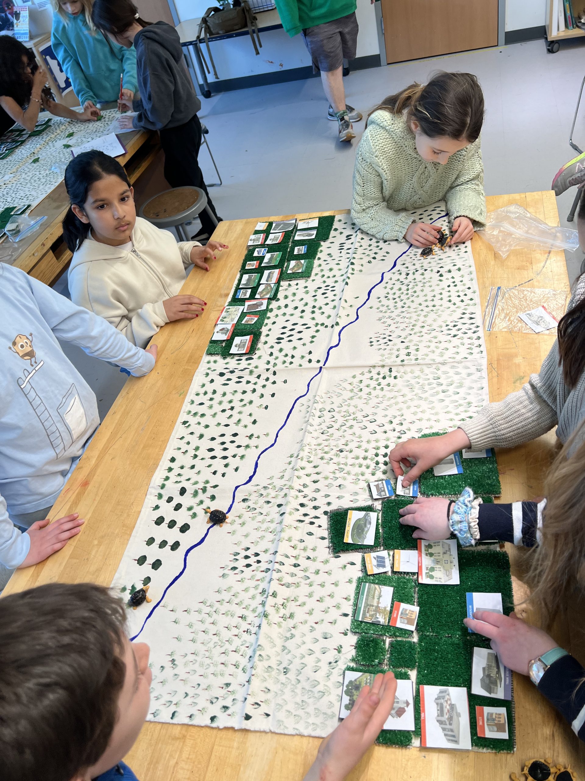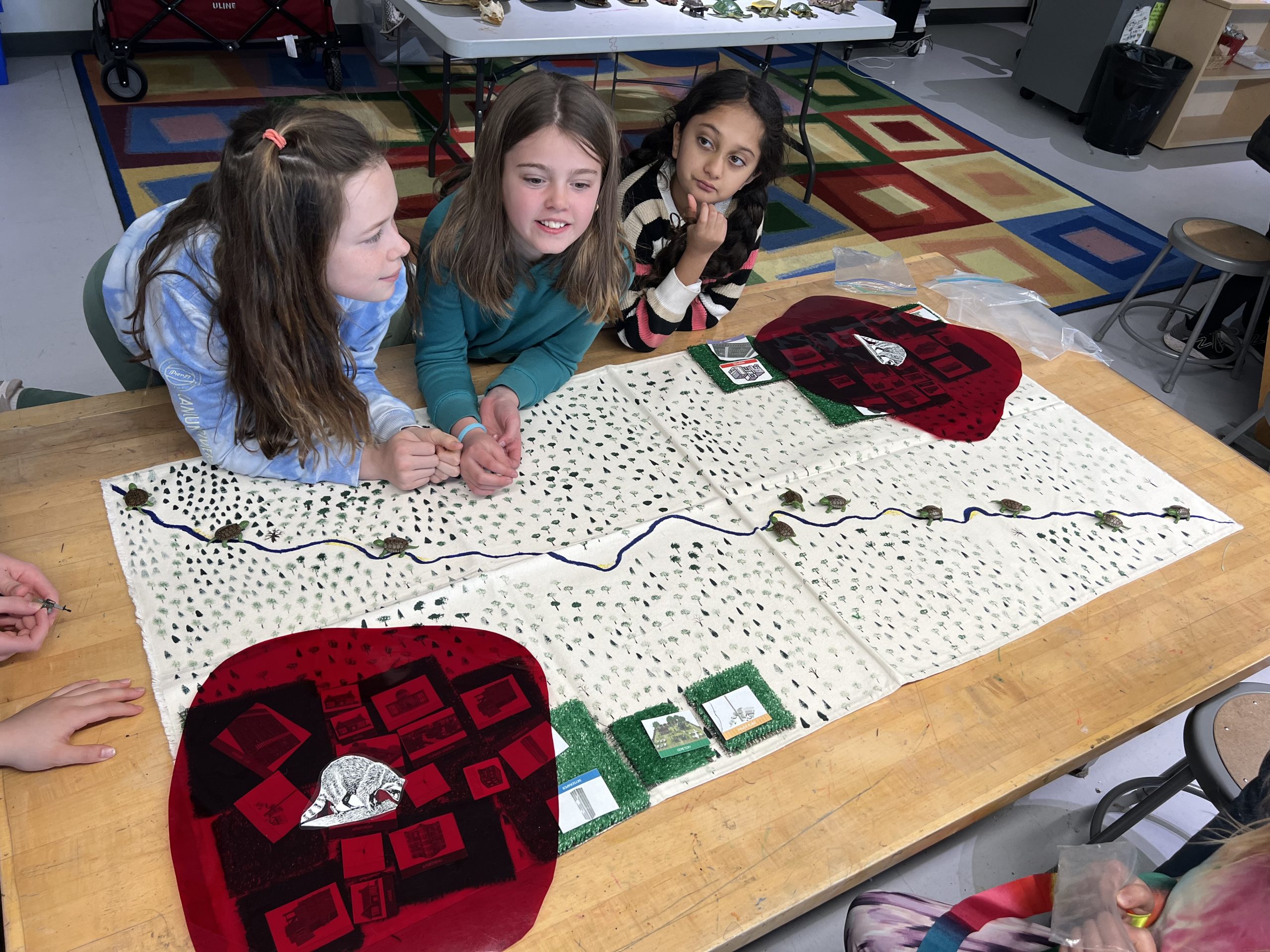 Turtle time: Students were first given plastic turtles and asked to lay them out evenly along a stream, representing a stable population in an undisturbed environment.